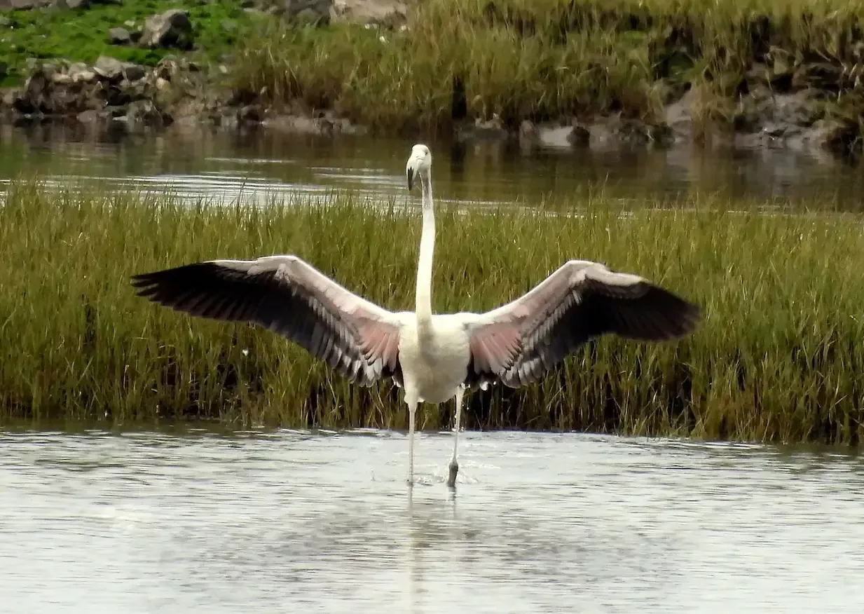 Flamenco con las alas abiertas en las Marismas de Santoña, uno de los humedales más importantes para la observación de aves en Cantabria